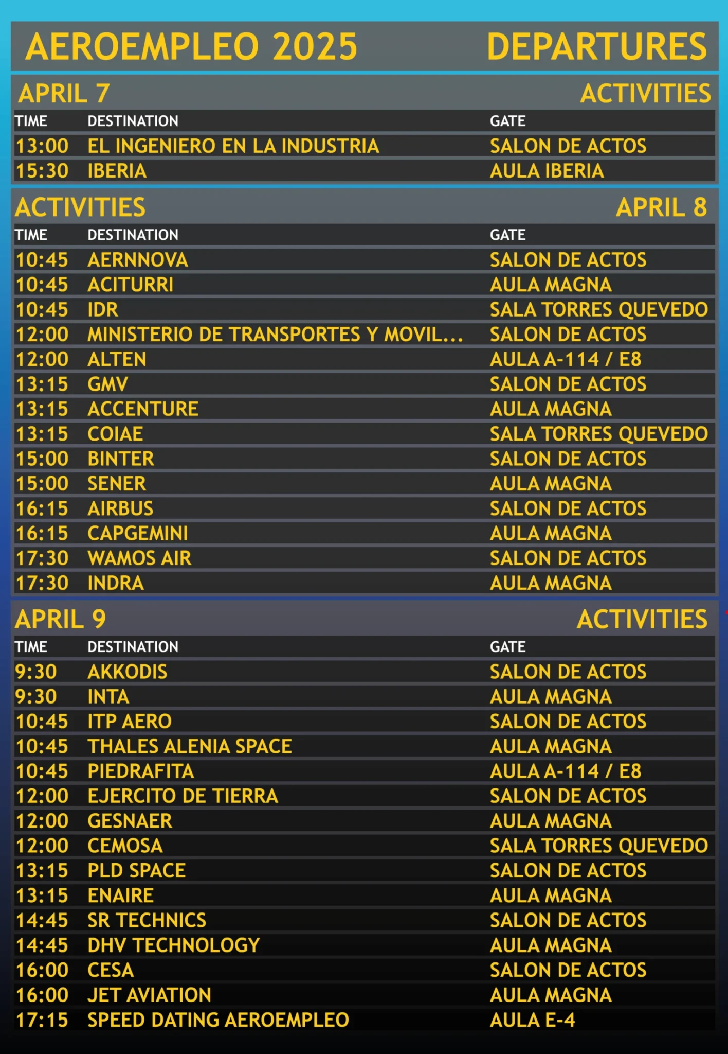 Aeroempleo celebró su séptima edición los días 8 y 9 de abril de 2025. Tras el relevo del anterior coordinador, el nuevo equipo de Aeroempleo demostró su capacidad de trabajo, renovando la ofreciendo nuevas soluciones para mejorar la experiencia de la Feria tanto a estudiantes como a empresas.